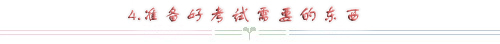 首先是準(zhǔn)考證、身份證這樣重要的證件,另外是考試需要的文具了。多準(zhǔn)備幾只黑色中性筆,不要討論什么圓珠筆能不能用之類的,現(xiàn)在辦公都是使用中性筆了,而且顏色純正比較正式,考試的時候還是給閱卷老師一個清爽規(guī)范的感覺。2B鉛筆、橡皮擦、小刀、計(jì)算器(科學(xué)計(jì)算器足矣);當(dāng)然更重要的是要帶上一塊表,時刻提醒和控制自己的答題時間,不要因?yàn)橐粌蓚€難題浪費(fèi)了時間、影響了大局。