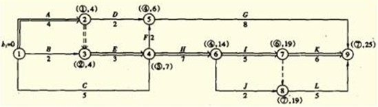 1.題中所提網(wǎng)絡計劃能滿足合同工期要求。因為用標號法計算,原網(wǎng)絡計劃的計算工期為25個月,如圖64所示,等于合同工期。工作A.E.H、I、K應作為重點控制對象,因為其為關鍵工作。