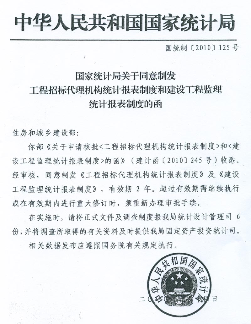 附件:1、國家統(tǒng)計(jì)局關(guān)于同意制發(fā)建設(shè)工程監(jiān)理統(tǒng)計(jì)報(bào)表制度的函(國統(tǒng)制[2010]125號(hào))