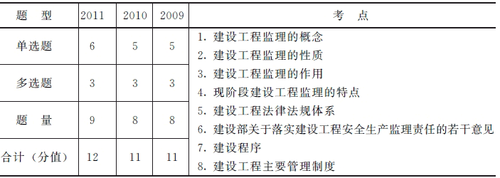 本章考生主要掌握有關(guān)建設(shè)工程監(jiān)理的性質(zhì)、作用和特點(diǎn),這是歷年考試的重點(diǎn),尤其是建設(shè)工程監(jiān)理性質(zhì)的內(nèi)容。近年來有關(guān)建設(shè)程序和建設(shè)工程管理制度的內(nèi)容也成為了命題的重點(diǎn),考生也必須掌握。本章在試題中所占分值在11分左右。