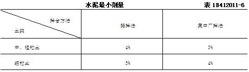 6. 水泥劑量水泥劑量應(yīng)通過(guò)配合比設(shè)計(jì)試驗(yàn)確定,但設(shè)計(jì)水泥劑量宜按配合試驗(yàn)確定的劑量增加0.5%~1%,對(duì)集中廠拌法宜增加0.5%,對(duì)路拌法宜增加1%.當(dāng)水泥穩(wěn)定中、粗粒土做基層時(shí),應(yīng)控制水泥劑量不超過(guò)6%.水泥的最小劑量應(yīng)符合表1B412011-6的規(guī)定。