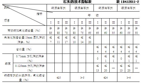 2.石灰:石灰技術(shù)指標(biāo)應(yīng)符合表1B412011-2的規(guī)定,應(yīng)盡量縮短石灰的存放時(shí)間。石灰在野外堆放時(shí)間較長(zhǎng)時(shí),應(yīng)覆蓋防潮。