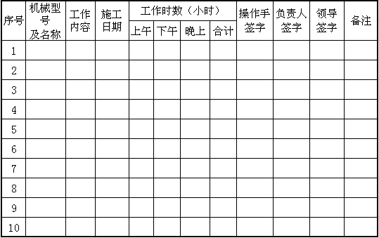 機械臺班是單位機械在一個工作班(8小時)內發(fā)揮的機械效能。 機械臺班統(tǒng)計表用于統(tǒng)計機械型號及名稱,工作內容等內容!