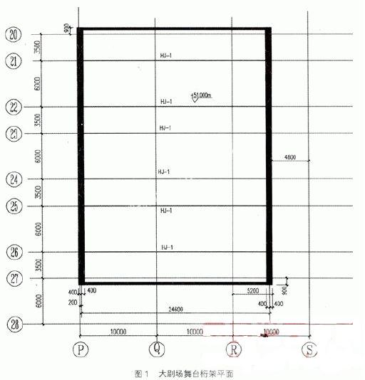 重慶大劇院工程項目總建筑面積103317m2,建筑高度64m,地上7層,地下2層,該工程結(jié)構(gòu)復(fù)雜,為筒體、框架、剪力墻加鋼結(jié)構(gòu)組成。該工程內(nèi)設(shè)大、中兩個劇場,大中劇場舞臺均為砼筒體結(jié)構(gòu)。屋頂均為鋼桁架,鋼桁架擱置底標(biāo)高分別為46m、37m。大劇場舞臺桁架(GHJ-1)每榀長25.05m、高4.6m、自重20.3t,整體重量193t;中劇場舞臺桁架(GHJ-2)每榀長22.55m、高4.1m,自重17.1t,整體重量133t。桁架由工廠標(biāo)準(zhǔn)化制作,預(yù)拼后將中間腹桿切斷,上下弦桿各分兩段,再運(yùn)輸?shù)浆F(xiàn)場安裝。下面僅對大劇場予以介紹,桁架布置如圖1、2所示。