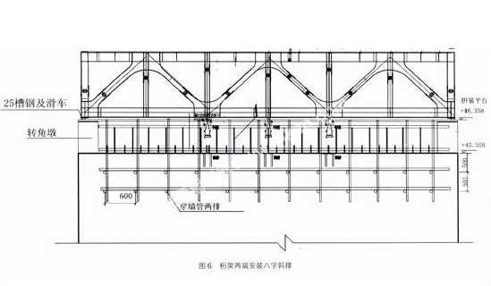 3.5在(27)軸搭設(shè)桁架對接三腳架懸挑拼裝平臺,進(jìn)行桁架豎立拼裝,并同時在桁架兩端安裝八字斜撐,見圖5、6。