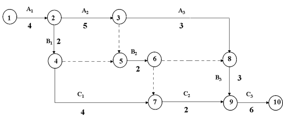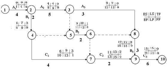 雙代號網(wǎng)絡(luò)圖,特別是雙代號時標(biāo)網(wǎng)絡(luò)圖,關(guān)于關(guān)鍵工作的確定、各工作時間參數(shù)計算。往年考試試題中,對于總時差、自由時差的計算出題頻率極高,考生應(yīng)特別關(guān)注。