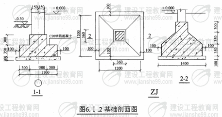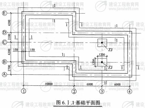 某工程基礎(chǔ)平面圖如圖6.Ⅰ.1所示,現(xiàn)澆鋼筋混凝土帶形基礎(chǔ)、獨(dú)立基礎(chǔ)的尺寸如圖6.Ⅰ.2所示;炷翂|層強(qiáng)度等級為C15,混凝土基礎(chǔ)強(qiáng)度等級為C20,按外購商品混凝土考慮;炷翂|層支模板澆筑,工作面寬度300mm,槽坑底面用電動夯實(shí)機(jī)夯實(shí),費(fèi)用計(jì)入混凝土墊層和基礎(chǔ)中。建|設(shè)工 程教|育網(wǎng)