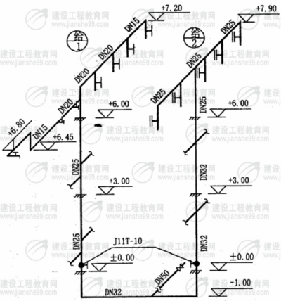 。⒐1:6.45-0.45)+(立管2:7.9-4.9)+[水平2:(1.08+0.83+0.54+0.9+0.9)]×3=6+3+12.75=21.75(m)(2.5分)