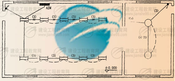2、管路均為鍍鋅鋼管Φ15沿墻、樓板暗配,頂管敷管標高4.50m,管內(nèi)穿絕緣導線ZRBV-500 2.5M