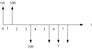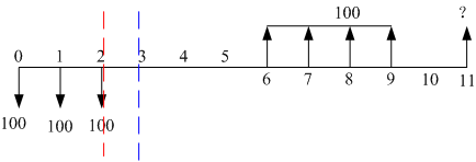 根據(jù)該現(xiàn)金流量圖計算:A=[100(F/A,10%,2)(F/P,10%,2)-100](F/P,10%,4)(A/F,10%,3)。