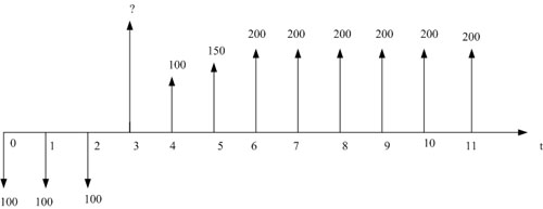 求出第3年末即第4年初的現(xiàn)值=-100(F/A,8%,3)(F/P,8%,1)+200(P/A,8%,6)(P/F,8%,2)+100(P/F,8%,1)+150(P/F,8%,2)=663.25(萬元)。