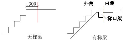 梯口梁內(nèi)側(cè)邊沿的內(nèi)側(cè)指的是樓地面的方向,外側(cè)指的是樓梯的方向。