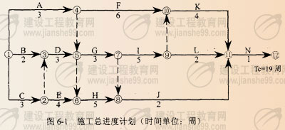 六、某工程,施工合同中約定:工期19周;鋼筋混凝土基礎(chǔ)工程量增加超出15%時,結(jié)算時對超出部分按原價的90%調(diào)整單價。經(jīng)總監(jiān)理工程師批準(zhǔn)的施工總進(jìn)度計劃如圖6-1所示,其中A、C工作為鋼筋混凝土基礎(chǔ)工程,B、G工作為片石混凝土基礎(chǔ)工程,D、E、F、H、I工作為設(shè)備安裝工程,K、L、J、N工作為設(shè)備調(diào)試工作。