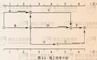 五、某工程,建設(shè)單位與施工單位按照《建設(shè)工程施工合同(示范文本)》簽訂了施工承包合同。合同約定:工期6個月;A、B工作所用的材料由建設(shè)單位采購;合同價款采用以直接費為計算基礎(chǔ)的全費用綜合單價計價;施工期間若遇物價上漲,只對鋼材、水泥和骨料的價格進(jìn)行調(diào)整,調(diào)整依據(jù)為工程造價管理部門公布的材料價格指數(shù)。招標(biāo)文件中工程量清單所列各項工作的估算工程量和施工單位的報價如表5-1所示,該工程的各項工作按最早開始時間安排,按月勻速施工,經(jīng)總監(jiān)理工程師批準(zhǔn)的施工進(jìn)度計劃如圖5-1所示。