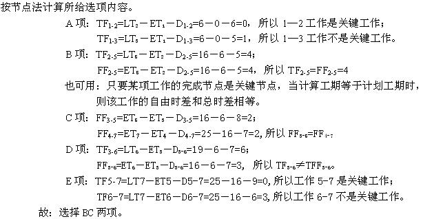 【解析】關(guān)鍵工作的判定有兩種方法,其一是利用總時差判定,即總時差最小的工作是關(guān)鍵工作。而工作總時差等于工作最遲開始時間與工作最早開始時間之差或工作最遲完成時間與工作最早完成時間之差;其二是利用關(guān)鍵線路判定,即關(guān)鍵線路上的工作為關(guān)鍵工作。其它說法均不正確。
