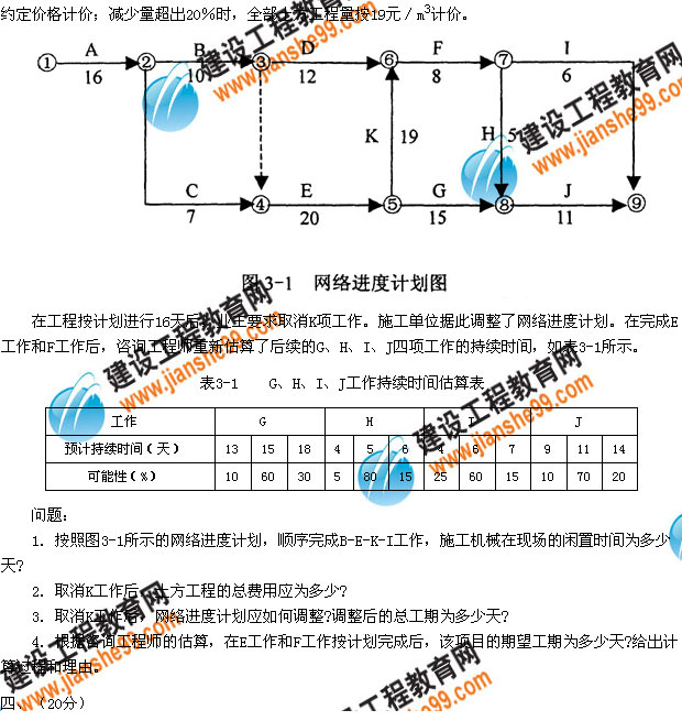 某工程項(xiàng)目合同上期為89天,網(wǎng)絡(luò)進(jìn)度計(jì)劃如圖3-1所示。其中,B、E、K、I四項(xiàng)工作均為土方工程,需安排同一臺(tái)土方施工機(jī)械先后順序施上,土方工程量分別估算為1100m3、2300m3、1600m3和800m3,土方綜合單價(jià)為18元/m3。合同規(guī)定,土方工程量減少不超出原估算工程量的20%時(shí),按原