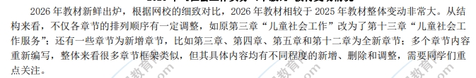 中國社會出版社2026中級社會工作者考試教材已下發(fā),2026年中級社會工作實務考試教材具體有哪些變化呢?根據(jù)網(wǎng)校的細致對比,2026年教材相較于2025年教材整體變動非常大。