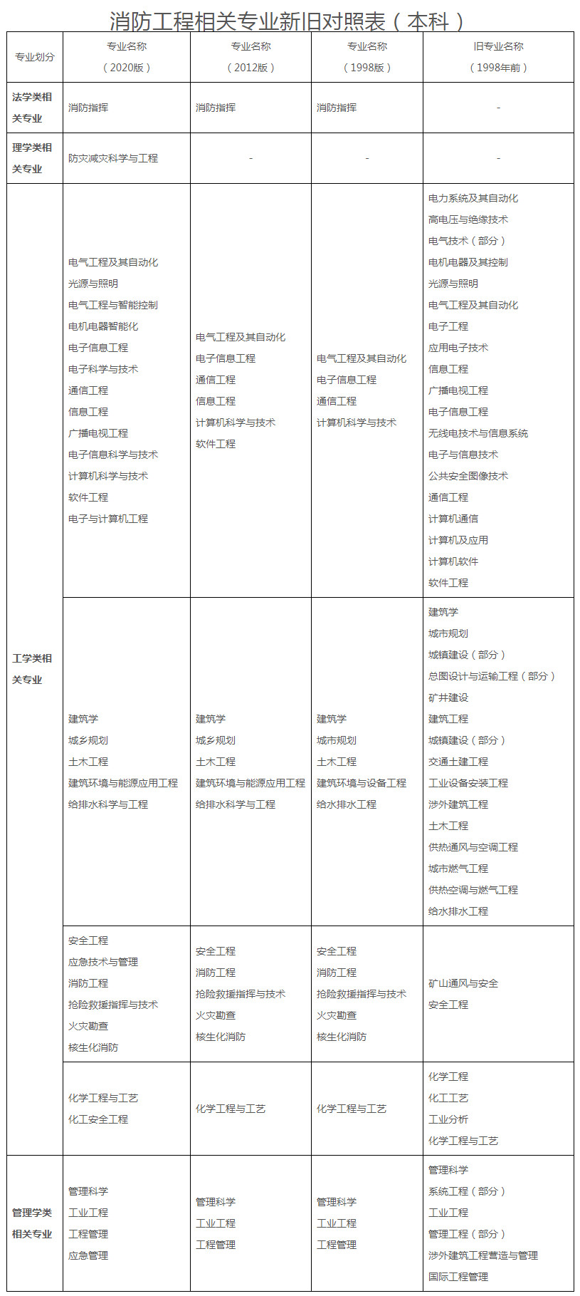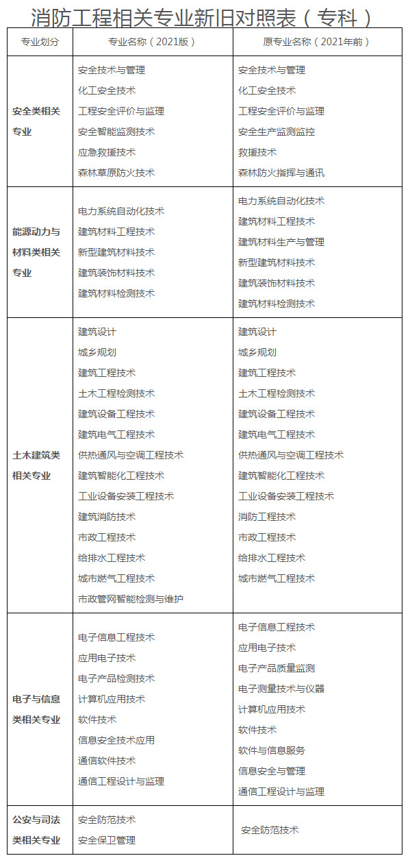3.依據教育部最新發(fā)布的《普通高等學校本科專業(yè)目錄(2012版、2020版)》和《高等職業(yè)教育專科專業(yè)(2021版)》,應急管理部消防救援局對《消防工程相關專業(yè)新舊對照表》增加了相關內容,詳見附表。