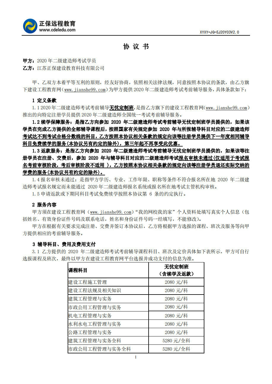 2020年二級(jí)建造師無(wú)憂定制班協(xié)議書(shū)
