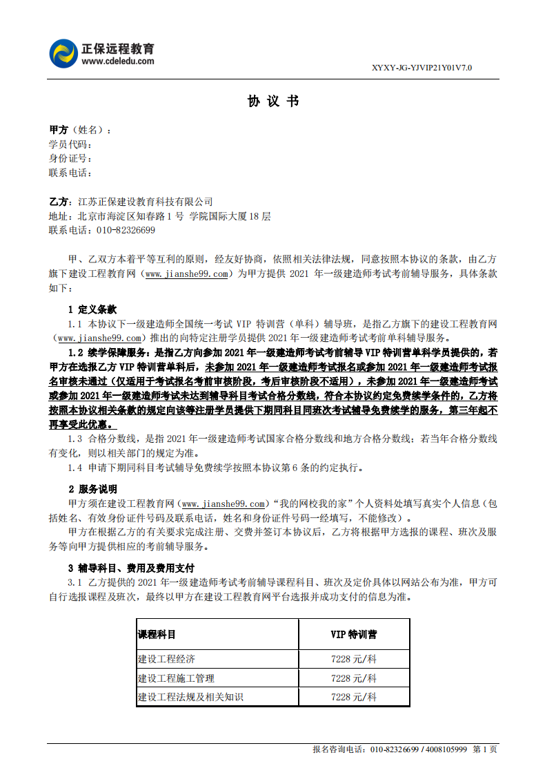 2021年一級(jí)建造師VIP特訓(xùn)營(單科)協(xié)議書