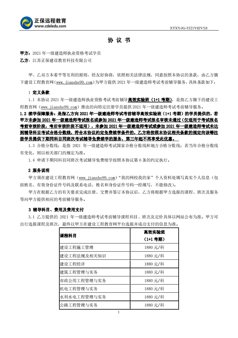 2021年一級建造師高效實(shí)驗(yàn)班續(xù)學(xué)協(xié)議書
