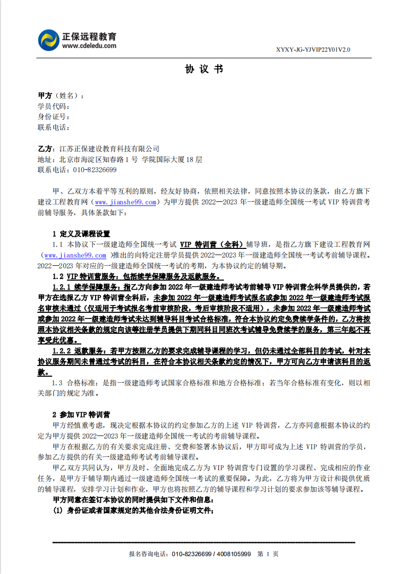 2022年一級建造師VIP特訓(xùn)營(全科)協(xié)議書