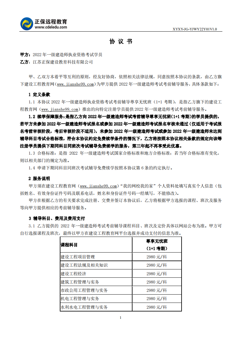 2022年一級建造師尊享無憂班續(xù)學協(xié)議書