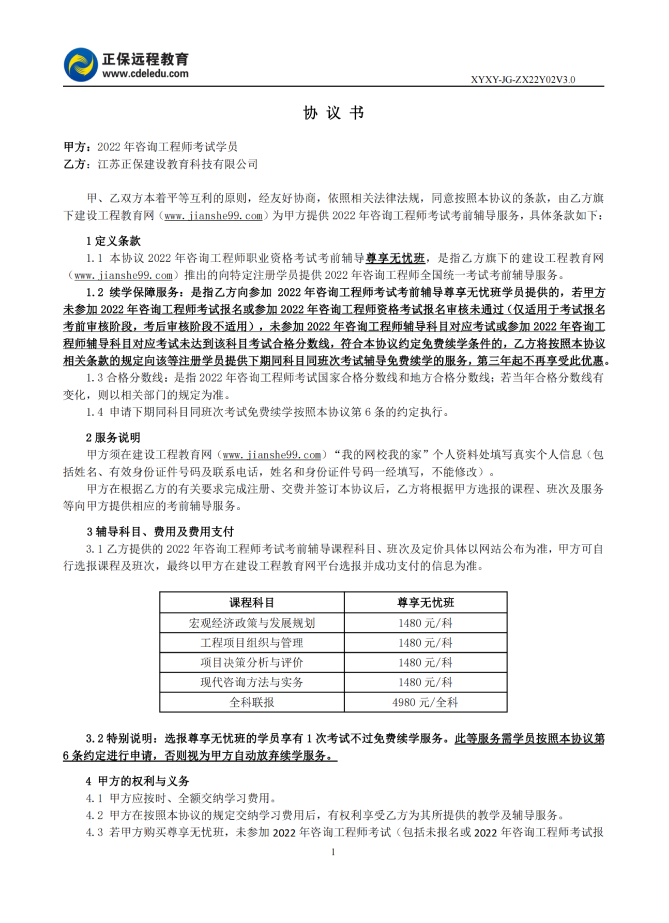 咨詢工程師尊享無(wú)憂班協(xié)議書