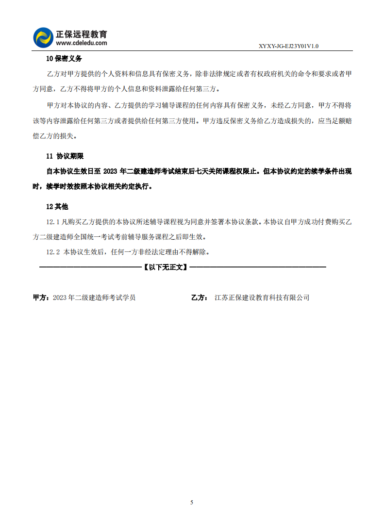 2023年二級建造師尊享無憂班1+1考期協(xié)議書