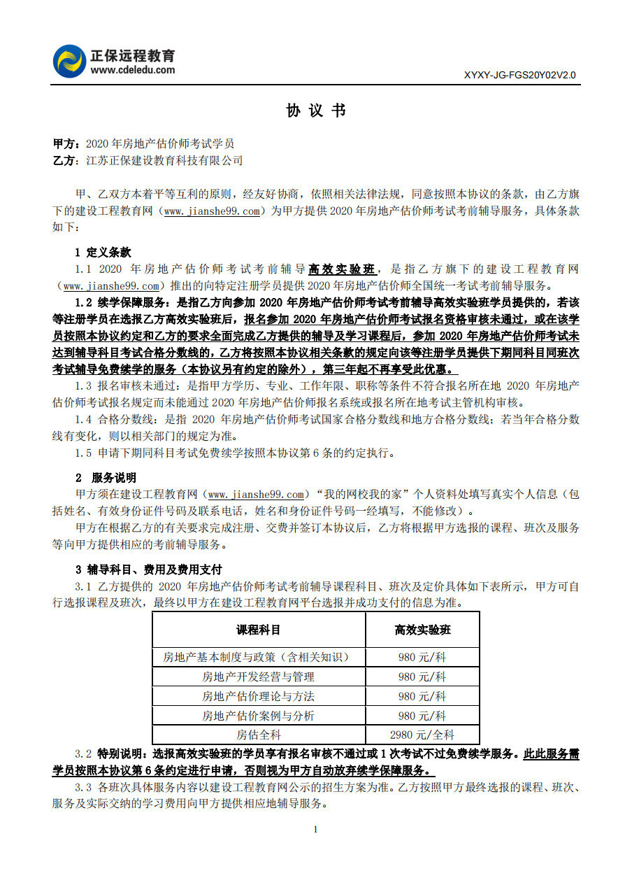 2020年房地產(chǎn)估價師高效實驗班協(xié)議書