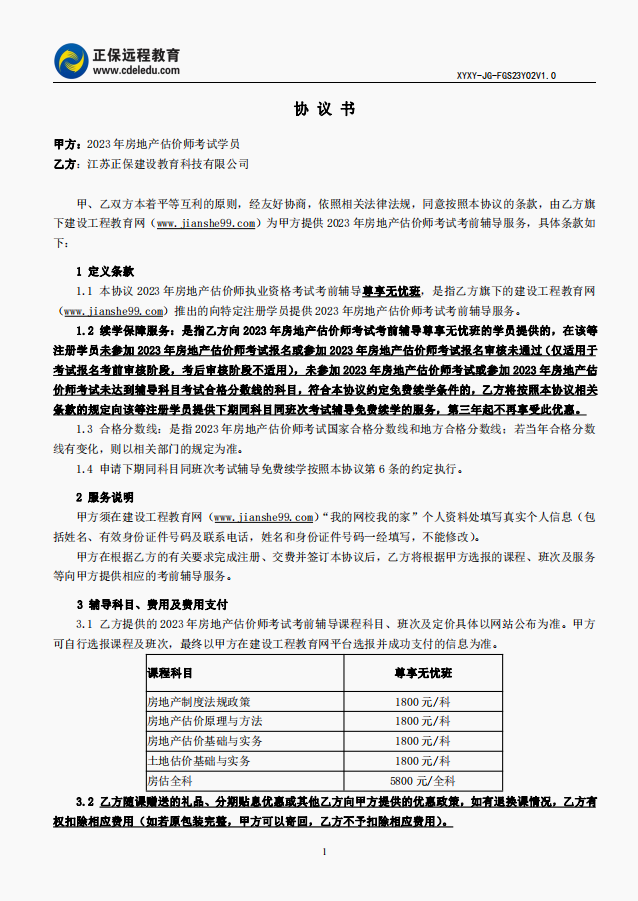 2023年房地產(chǎn)估價(jià)師尊享無(wú)憂(yōu)班協(xié)議書(shū)