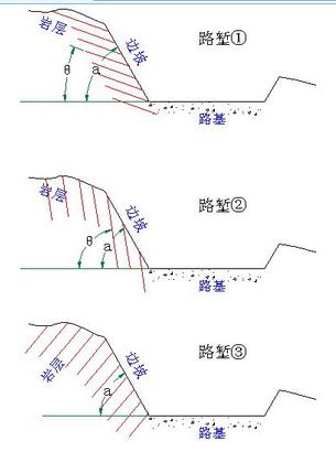 A. 路線走向與巖層的走向垂直,但巖層傾向與邊坡傾向相反時
