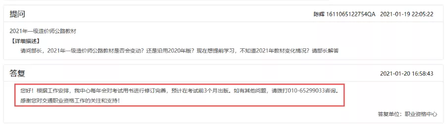 2021年一級造價師公路教材是否會變動?還是沿用2020年版?這是在交通運輸部資訊平臺中,學員咨詢的問題。