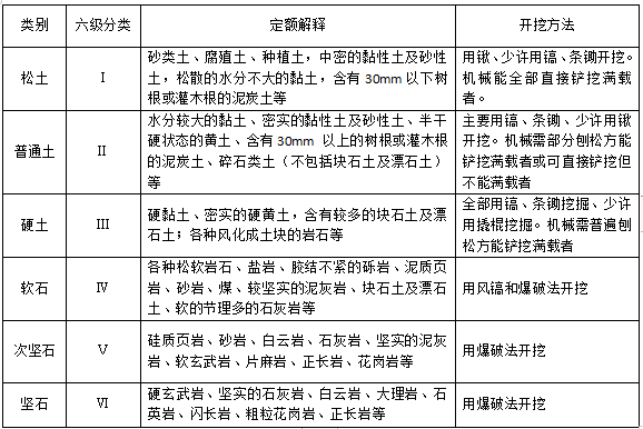 根據(jù)土石方開挖的難易程度將土壤、巖石分為六類。土壤分為三類,巖石分為三類。