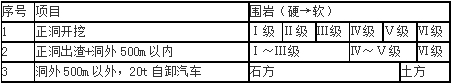 2.隧道工程在對隧道開挖、出渣時,要根據(jù)不同的圍巖級別進行定額選套。其中洞外出渣要套用路基的定額,具體關(guān)系對應(yīng)如下: