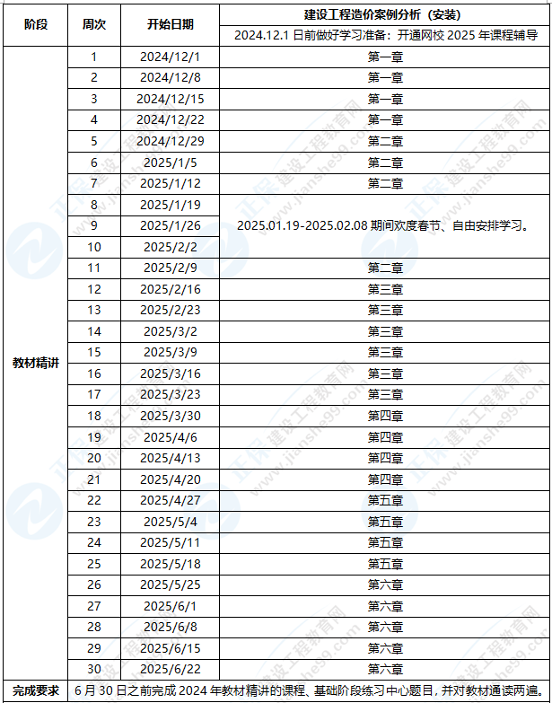 1、整體進度說明:本計劃表從2024年12月1日開始執(zhí)行,計劃于2025年6月30日結(jié)束,共計30周;其中:教材精講階段安排27周,春節(jié)調(diào)整階段3周。學(xué)員可根據(jù)本表的提示,結(jié)合自己的工作,學(xué)習(xí)情況進行細化,并按網(wǎng)校要求完成聽課、做題的學(xué)習(xí)任務(wù),基本可滿足考試需要。