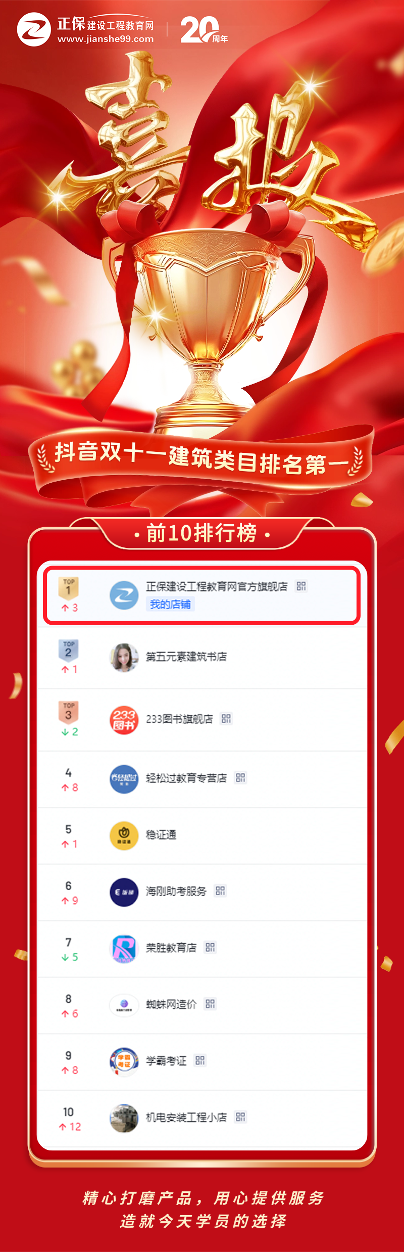 抖音官方榜單新鮮出爐!在剛剛過(guò)去的爽十一大戰(zhàn)中,正保建設(shè)工程教育網(wǎng)抖音旗艦店】以絕對(duì)優(yōu)勢(shì)登頂建筑類目排行榜NO.1!這是繼“20周年”之后,我們送給全體建工學(xué)子與行業(yè)同仁的又一份硬核成績(jī)單!感謝各位同學(xué)用信任與認(rèn)可,把網(wǎng)校托舉至抖音官方榜的巔峰。二十載春秋,我們始終懷揣初心,各位考生每一次下單、好評(píng)與通關(guān)拿證,都是照亮我們繼續(xù)前行的燈塔。未來(lái),我們將以更精品的課程、更貼心的服務(wù),陪伴更多建工人把“建筑夢(mèng)”照進(jìn)現(xiàn)實(shí),攜手再攀下一座行業(yè)高峰!