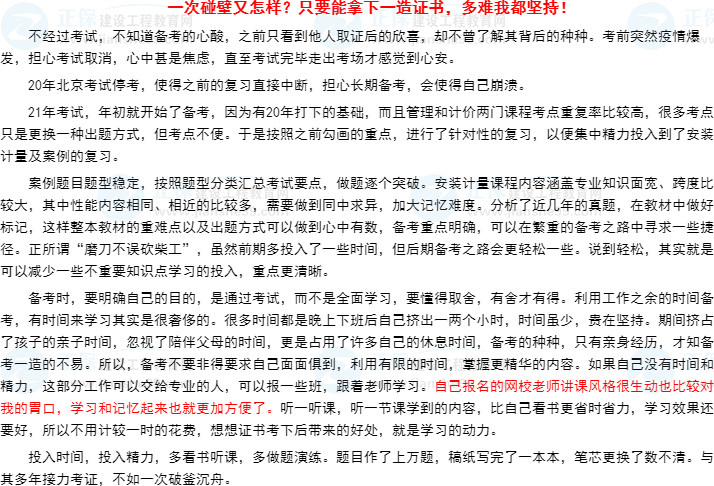 2021年一級造價師考試已經(jīng)結(jié)束,建設(shè)工程教育網(wǎng)在這個考試結(jié)束之際,推出了“我的造價備考之路”有獎?wù)魑幕顒?!你投稿我發(fā)獎,在這個考完的放松時刻,讓你說出你的備考心得,分享你的備考醫(yī)路,在此小編為大家整理參與活動的投稿內(nèi)容,一起分享大家的備考感悟與心得: