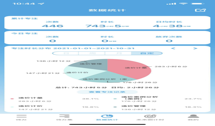 從2021年1月1日至2021年10月31日為止,一共花在造價(jià)考試的時(shí)間是743h,其中管理136h,計(jì)價(jià)147.5h,計(jì)量283h,案例分析176.5h。