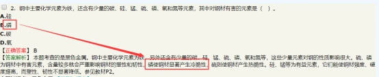 【試題1】鋼材元素中,含量較多會嚴(yán)重影響鋼材冷脆性的元素是( )。