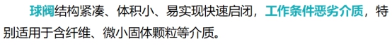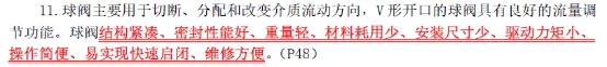 【解析】球閥在管道上主要用于切斷、分配和改變介質(zhì)流動方向,設(shè)計(jì)成V形開口的球閥還具有良好的流量調(diào)節(jié)功能。球閥的選用特點(diǎn):適用于水、溶劑、酸和天然氣等一般工作介質(zhì),而且還適用于工作條件惡劣的介質(zhì),如氧氣、過氧化氫、甲烷和乙烯等,且適用于含纖維、微小固體顆料等介質(zhì)。參見教材P48。