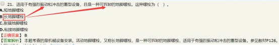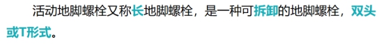 【解析】活動地腳螺檢:又稱長地腳螺栓,是一種可拆卸的地腳螺栓,這種地腳螺栓比較長,或者是雙頭螺紋的雙頭式,或者是一頭螺紋、另一頭T字形頭的T形式。適用于有強(qiáng)烈震動和沖擊的重型設(shè)備。參見教材P126。