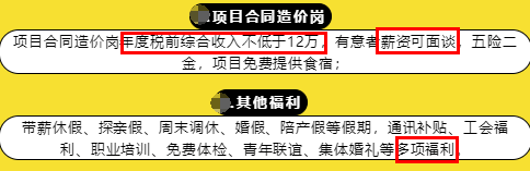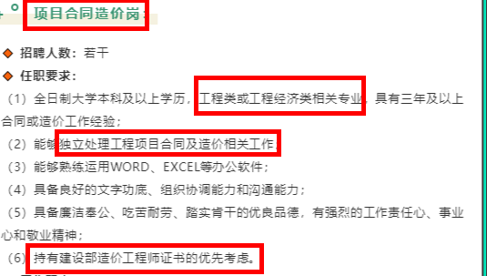 以下是某大型企業(yè)的招聘信息,招聘崗位是項(xiàng)目合同造價(jià)崗,最后任職要求里明確說到持有一級造價(jià)工程師證書的會(huì)被優(yōu)先考慮,所以這也足以說明這個(gè)證書是有一定優(yōu)勢的。