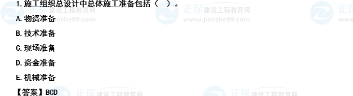 【考后點(diǎn)評(píng)】主要錯(cuò)誤選項(xiàng)A。施工組織總設(shè)計(jì)中包括總體施工準(zhǔn)備和主要資源配置計(jì)劃,錯(cuò)誤選項(xiàng)“物資準(zhǔn)備”對(duì)應(yīng)的是主要資源配置計(jì)劃中的材料設(shè)備配置計(jì)劃,沒(méi)有包含在施工準(zhǔn)備中,如果想當(dāng)然,準(zhǔn)備就要準(zhǔn)備“人材機(jī)”,就會(huì)掉入出題人的陷阱。