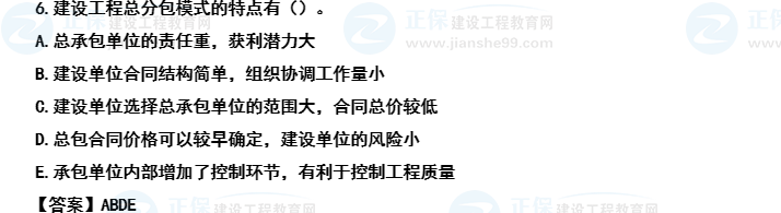 【考后點(diǎn)評(píng)】主要錯(cuò)誤原因漏選E。本題正確選項(xiàng)4個(gè),能選對(duì)3個(gè)選項(xiàng)就很不錯(cuò)了,漏選較多的是E選項(xiàng),涉及內(nèi)容是特點(diǎn)中的第三點(diǎn),有利于控制工程質(zhì)量部分的內(nèi)容,如果看書(shū)不仔細(xì),會(huì)忽略本段后面的解釋部分。