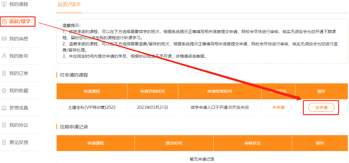 1、打開網(wǎng)校首頁,登錄購買課程的賬號,點擊【我的課程】進入【我的網(wǎng)校我的家】,然后點擊左側(cè)導(dǎo)航中的【返款/續(xù)學】,可看到需續(xù)學的課程,然后點擊【去申請】。