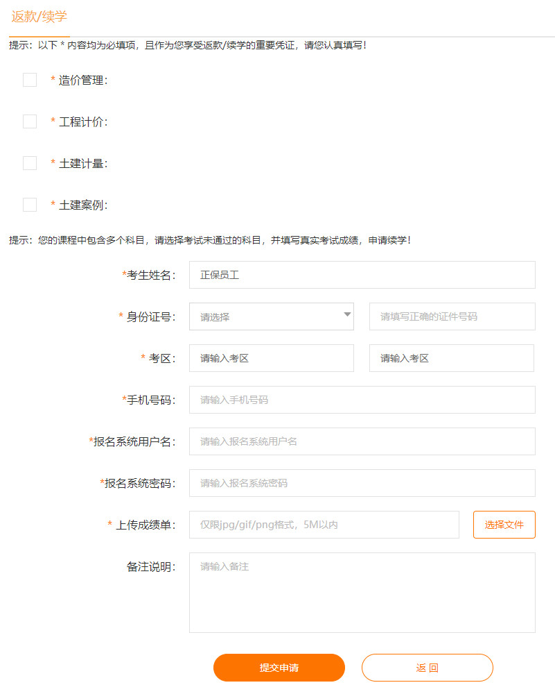 考生需在其報考所在地區(qū)一級造價師考試查分入口開通后30日內(nèi)向網(wǎng)校提供報名信息(未報名學員提供身份證號碼),或未通過的成績證明。未在規(guī)定時間內(nèi)提交續(xù)學申請將視為自行放棄續(xù)學申請,網(wǎng)校不再予以辦理。