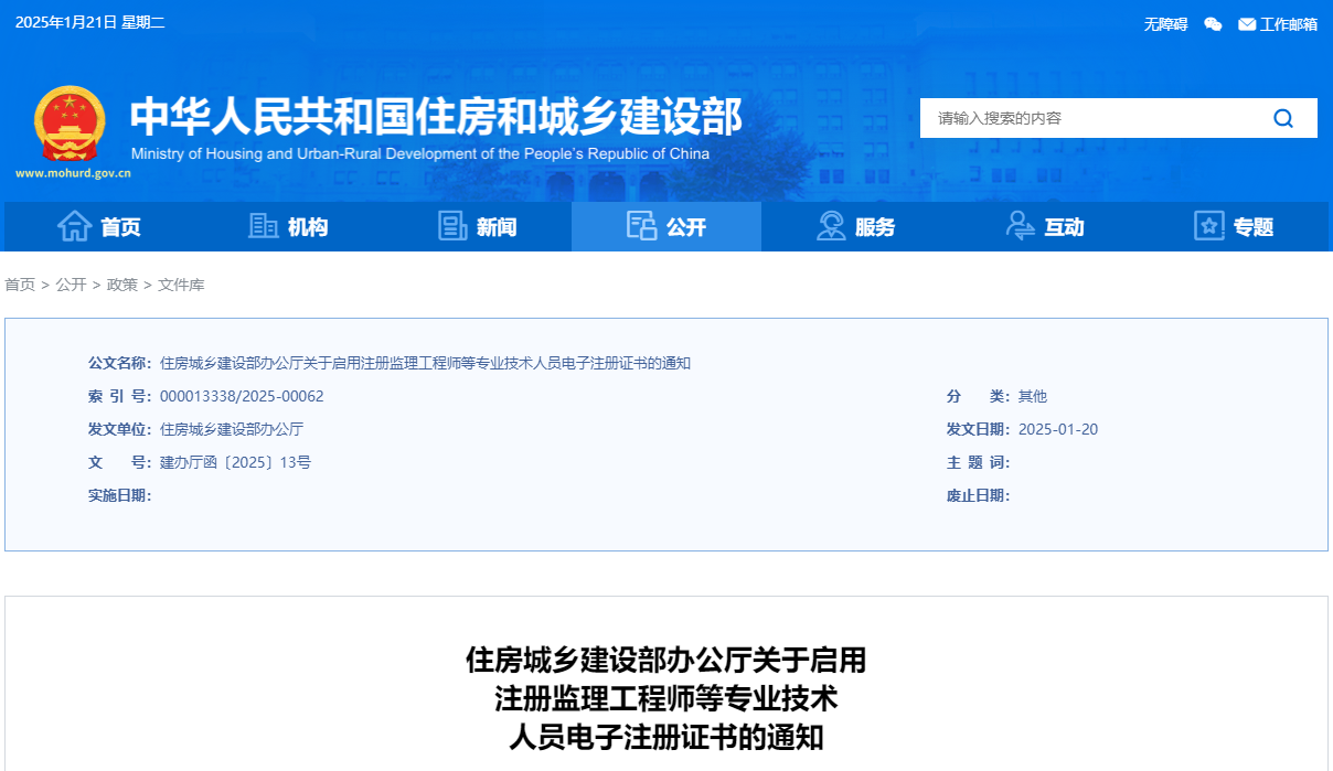 住房城鄉(xiāng)建設(shè)部啟用注冊(cè)一級(jí)造價(jià)工程師等專業(yè)技術(shù)人員電子注冊(cè)證書