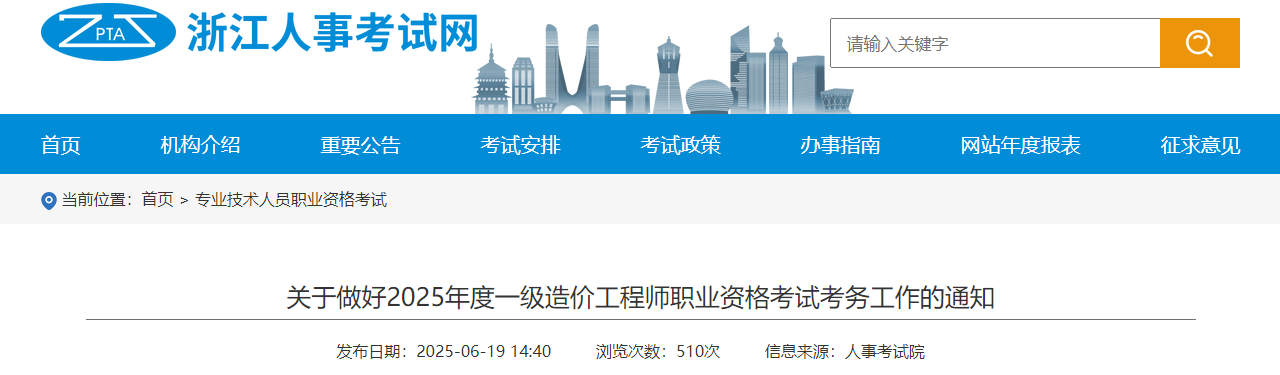 浙江省2025年度一級(jí)造價(jià)工程師職業(yè)資格考試考務(wù)工作的通知已發(fā)布,6月27日9:00至7月7日17:00報(bào)名,10月18日至19日考試,官方通知內(nèi)容如下: