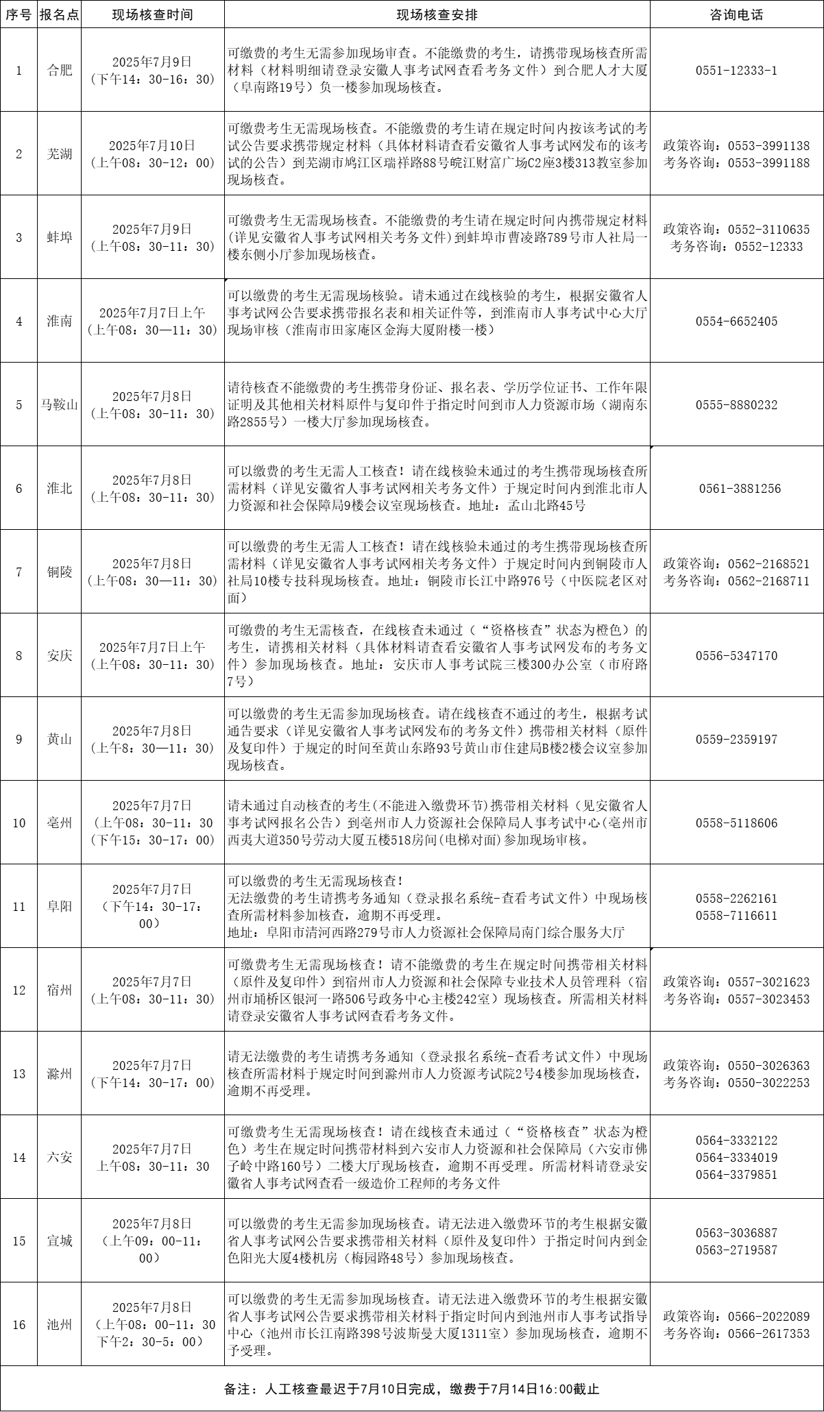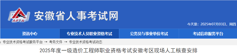 2025年度一級(jí)造價(jià)工程師職業(yè)資格考試安徽考區(qū)現(xiàn)場人工核查安排